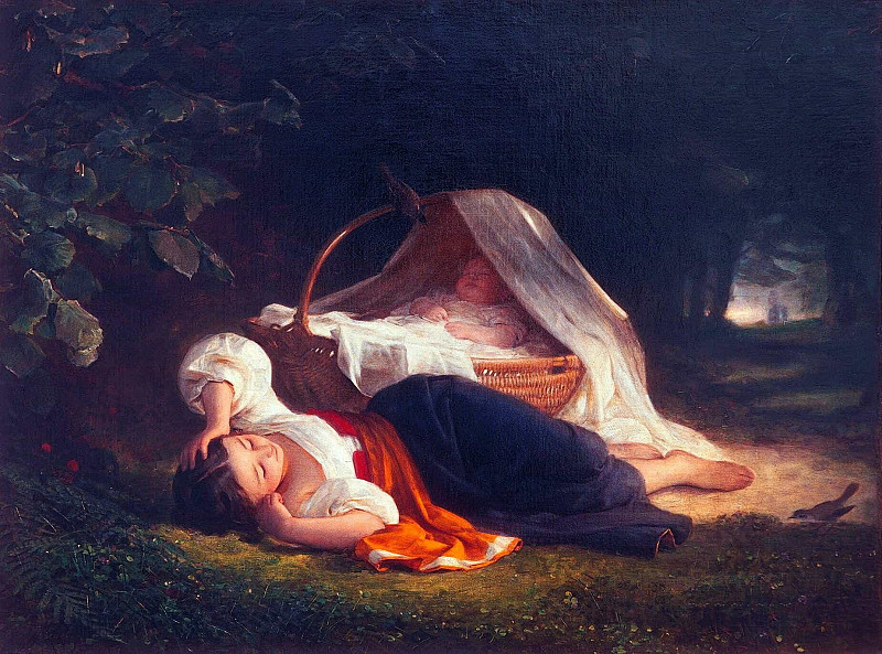整幅作品通过冷暖色调的对比 – – 深蓝色的夜影与温暖的肤色、橙色衣饰及远处微光 – – 构建出一种既安宁又略带忧郁的情感基调。画家并未描绘激烈的动态,而是捕捉了生命中最纯真的休憩瞬间,暗示着手足之间相依为命的深厚情感以及对未来的无声祈愿。那远处的光亮或许象征着归宿或希望,而近处的黑暗则衬托出此刻梦境的珍贵与脆弱。