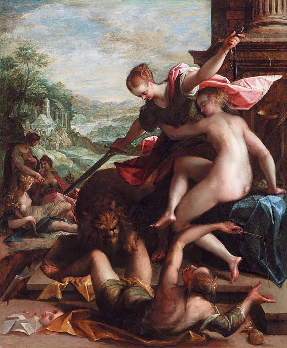 色彩运用上,深褐与黑色的沉稳色调衬托出红色斗篷的鲜明,而人物肌肤的光泽则在暗背景中尤为突出,营造出一种古典油画特有的厚重感与光影对比。整幅作品通过丰富的象征符号 – – 利剑、天平、明灯与雄狮,构建了一个关于善恶终有报的道德叙事,传达出真理不可战胜、正义必将伸张的永恒主题。