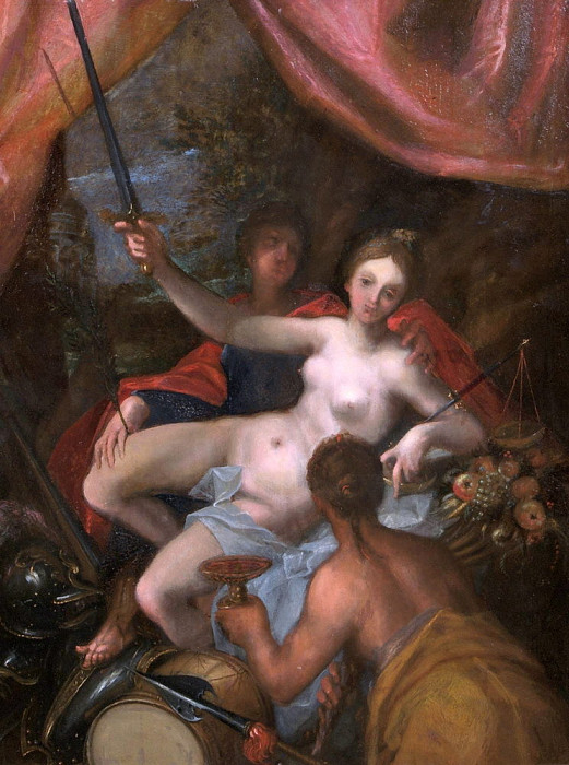 前景中,一位背对观者、身披金黄色织物的人物正双手捧着一只高脚杯,姿态谦恭地向中心人物敬献。画面右侧悬浮着天平与盛满果实的容器,石榴与葡萄等物产象征着丰收与富足,而左下角则散落着钢盔与盾牌等战争器具,暗示着和平是对战乱的终结或驾驭。整体色调以暗褐为底,辅以浓郁的朱红、金黄与柔和的肉色,强烈的明暗对比不仅突出了人物的立体感,更营造出一种庄重而神秘的氛围,将观者的目光牢牢锁定在关于权力、正义与丰饶的隐喻之上。
