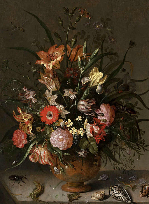 Bouquet of flowers in a vase, insects and tiny creatures — Jacob Marrel