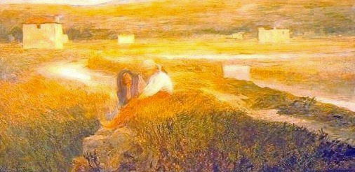 色彩的运用极具表现力,大面积的赭石与金黄交织成落日余晖的质感,而草丛间点缀的紫蓝色阴影则暗示着暮色四合时的凉意。这种冷暖色调的对比不仅塑造了空间的纵深感,更在视觉上营造出一种宁静中透着淡淡哀愁的氛围。笔触松散而灵动,捕捉了光影流动的瞬间,引导观者沉浸于这片被夕阳染色的旷野之中,感受那份关于时光流逝与静谧沉思的情感共鸣。