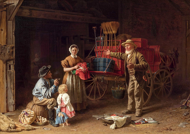 构图上,两人一坐一站形成稳定的视觉重心,视线交汇于手中的杯盏之间,建立起紧密的情感联系与互动关系。散落在地面的红苹果与铺满的金黄稻草暗示了季节背景,暖黄色的光线洒在人物面部、衣物褶皱及玻璃杯壁上,强化了材质的质感与室内的温暖氛围。整幅作品通过对质朴劳作场景的细腻刻画,传递出一种源自辛勤劳动后的宁静喜悦,以及人与人之间淳朴真挚的情谊,仿佛让观者闻到了新酿果汁的清香与秋日谷仓中特有的干草气息。
