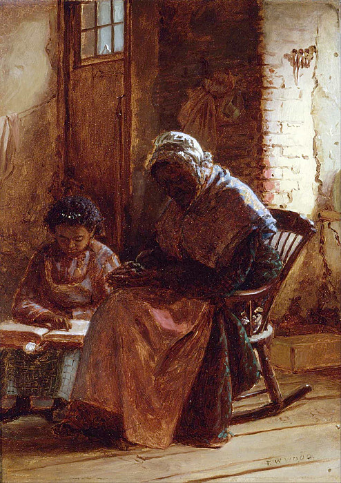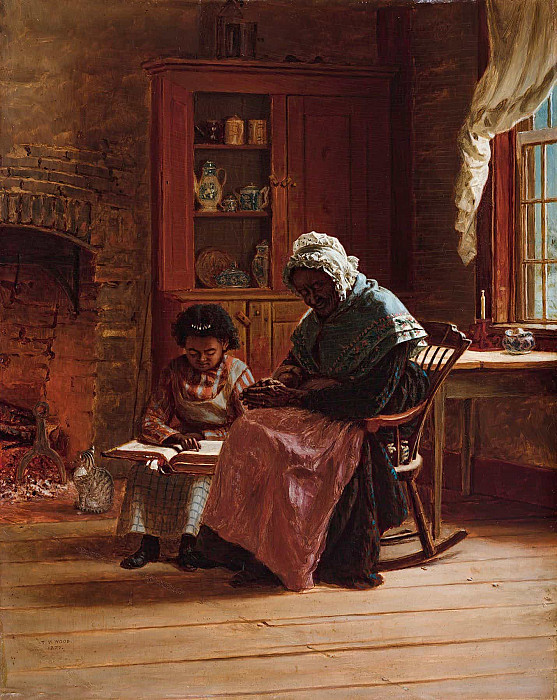 老者身着深色长裙与头巾,外披蓝绿色披肩,正坐在摇椅上专注地进行着手中的针线活计,神态安详而慈爱。身旁的幼童穿着条纹围裙,膝上摊开一本厚重的书籍,正全神贯注地阅读,仿佛正在聆听长者教导或汲取知识。两人之间没有言语的交流,却通过肢体语言和共同的空间营造出一种亲密无间的代际纽带。